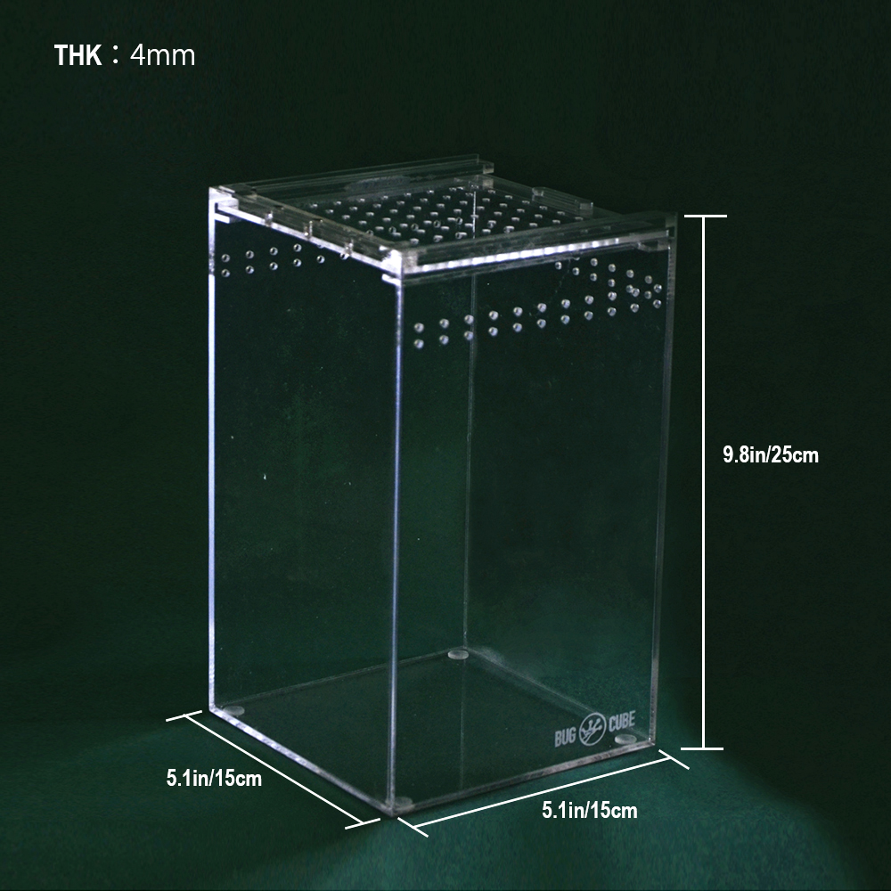 A caixa de alimentação de répteis é feita de acrílico. Após a montagem, o tamanho é de 15 × 15 × 25 cm (5,91 × 5,91 × 9,84 polegadas). Possui um ângulo de visualização completo de 360 graus, é completamente transparente, claro e brilhante, permitindo que você observe os comportamentos de seus pequenos animais de estimação a qualquer momento e em qualquer lugar. Também é fácil de observar e limpar. Além disso, a caixa é feita de placa de acrílico espessada de 4 mm, que tem melhor preservação de calor e é mais durável.